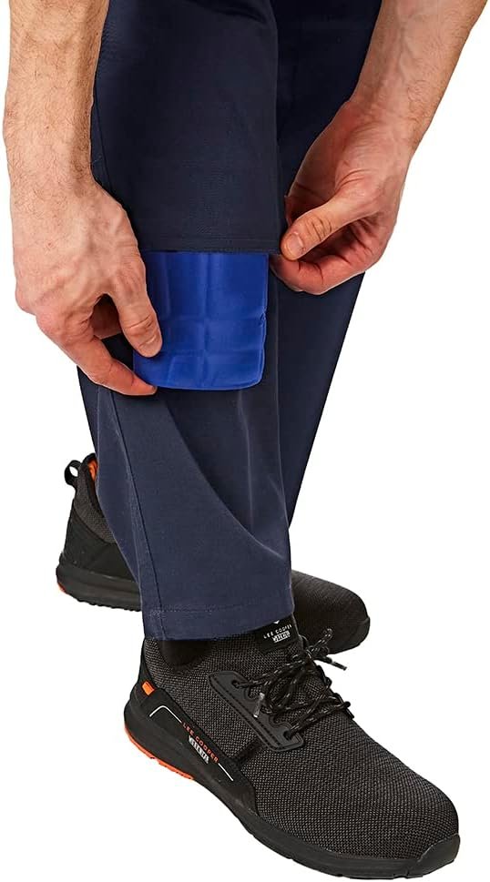 Saugumas yra priešakyje, nes kelnės turi kelių apsaugos kišenėles, kurios leidžia įkišti kelių pagalvėles, kurios apsaugo kelius.