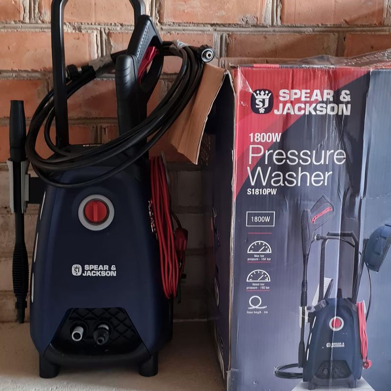 Labai geros būklės aukšto slėgio plovimo įrenginys su žarnos rite ir namų rinkiniu, skirta dideliems nešvarumams šalinti nuo takų ir automobilių.